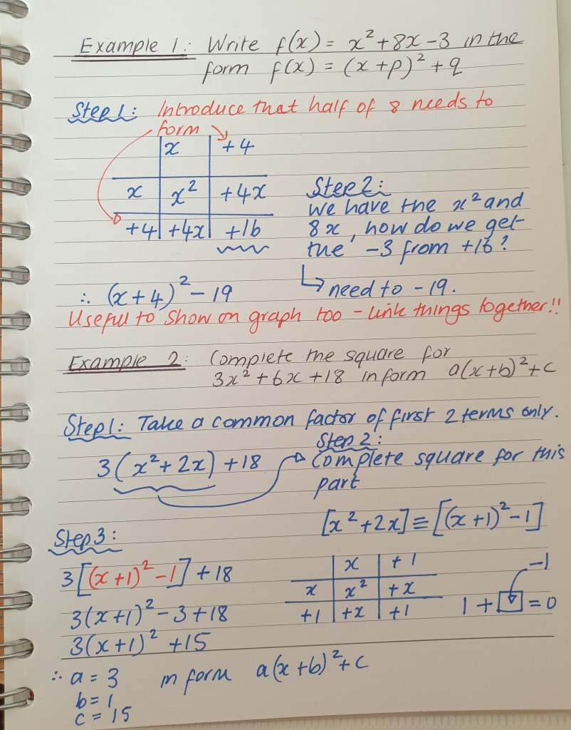 Another part of the session that I absolutely LOVED was the use of the area model to teach various aspects of Maths. From short division to completing the square using the model, my mind was opened. So far I had only used this model when teaching multiplication and expanding brackets, but after seeing ‘completing the square’ being done using this – so simply too – I will definitely be embedding this into my teaching in the future. Below, I have included a snapshot of my notes from the day to show the example Siōbhán went through.