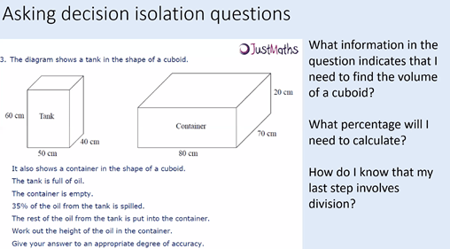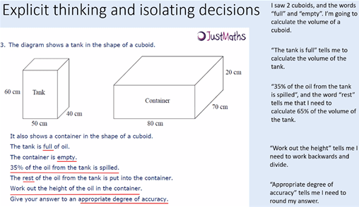 It is not that the students do not know what to do when answering questions, as I have found in my own practice, but sometimes they just do not know where to begin and how to unpack a question. What was really highlighted to me during this session was the detail in explicit thinking he suggested when modelling a question that I have never truly practiced. I have focused primarily on the calculations and often asking meaningless questions like “what is 60 x 50 x 40 ” if it were this question rather than focusing on the process and why I am using that process.
